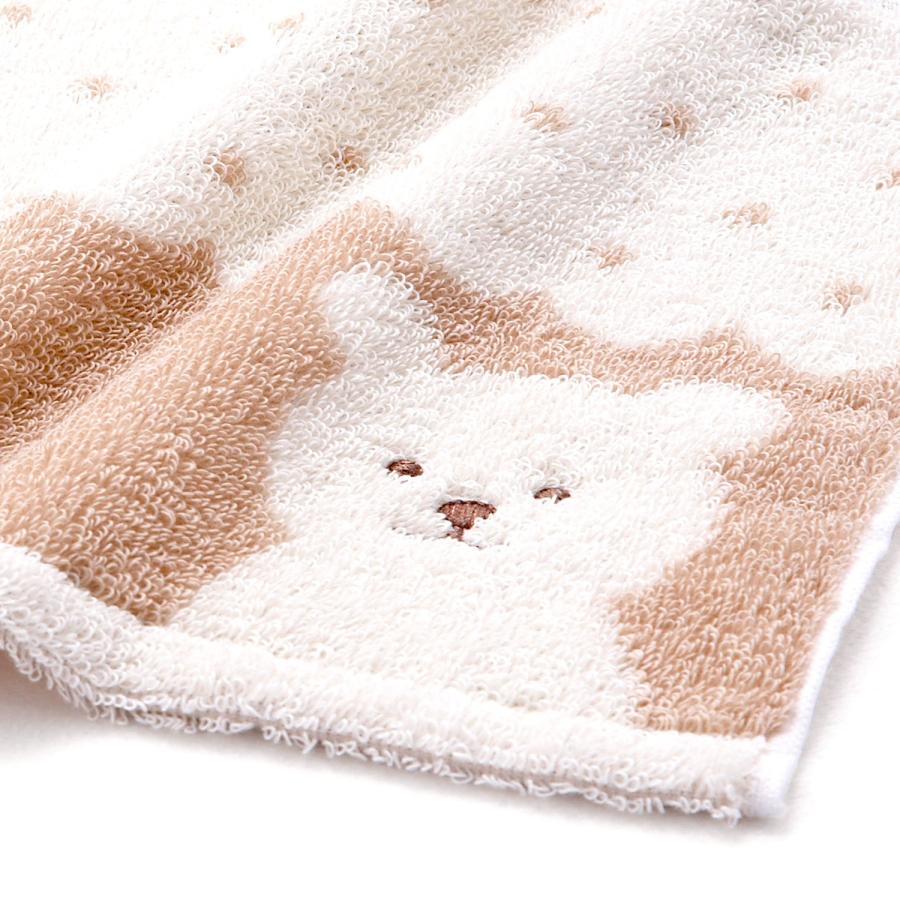 ナチュラルな色合いにドット柄とにっこり笑ったくまの表情が可愛いタオルです。